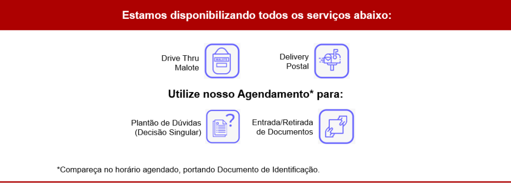 ATENDIMENTO PRESENCIAL PARA PROTOCOLO / PLANTÃO DE DÚVIDAS (Decisão Singular) / RETIRADA DE PROCESSOS: Caso deseje atendimento presencial, deverá realizar o agendamento prévio através da Central de Atendimento